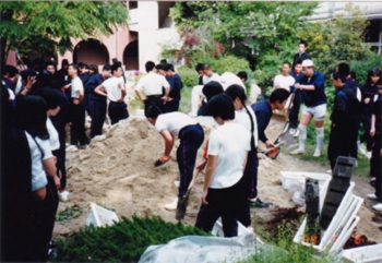 写真は第44回卒業生が一年生のときに、中庭の土を入れ替えているところである。