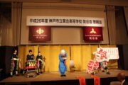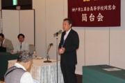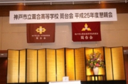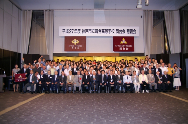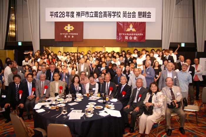 平成29年6月24日(土)平成29年度筒台会定時総会・懇親会が開催されました。今年は葺合高校新校舎が完成しましたので、定時総会は母校国際交流棟フェニックスホールで行いました。定時総会前には、筒台会会員の皆様に校舎見学をしていただきました。本館に入り職員室、その廊下にはテーブル椅子が置いてあり生徒が自習をしたり、歓談したりしています。グランドは上筒井小学校、筒井台中学校の校舎が南側に移り、幅広くなっています。奥にはテニスコートが整備され、プールは国際交流棟の4階に設置されています。本館北側2階にアリーナ、講堂も兼ねています。1階は柔道場、武道場、その前にはトレーニングルーム、部室があります。北館には1階が食堂、2階が音楽室、3階が多目的室。渡り廊下を通って国際交流棟に。国際交流棟は1階が図書室、2階が和室、GSroom、そしてフェニックスホールです。中庭では緑の木々に囲まれての歓談スペースもあります。定時総会も各議案が滞りなく終わり、懇親会のANAクラウンプラザホテル神戸へ移動しました。懇親会は新卒も含め250名が出席。織戸新会長の挨拶から始まり、母校助成金贈呈を行い、乾杯、会食、歓談へと進行しました。新卒代表の万歳三唱でお開きとなるまで、先輩後輩と語り合い有意義な時間を過ごしました。