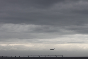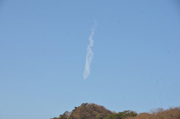 渡月橋の真上は2本の飛行機雲が尾を引くだけの青い空。
